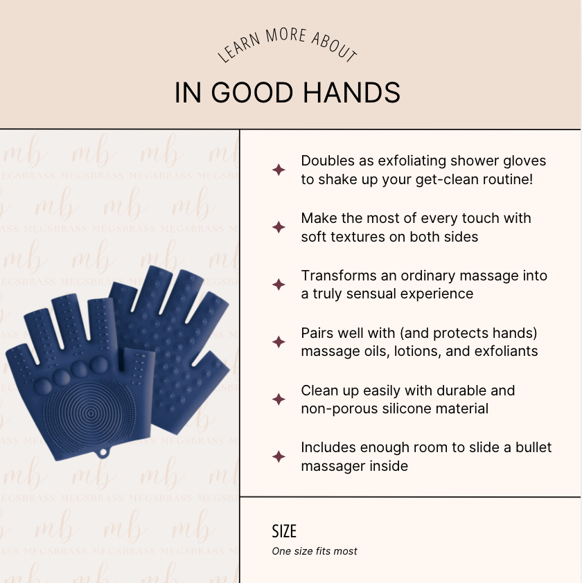 Silicone nubs and patterns on the surface of the gloves can either gently wash & exfoliate in the shower when used with your favorite shower gel for a germ free clean, or to create tantalizing sensations while you explore your partner and use them for sensual massage. Use the gloves with massage oil and your favorite bullet vibrator for a truly sensual hands-on experience. These marvelous mittens put the power of foreplay In Good Hands.
