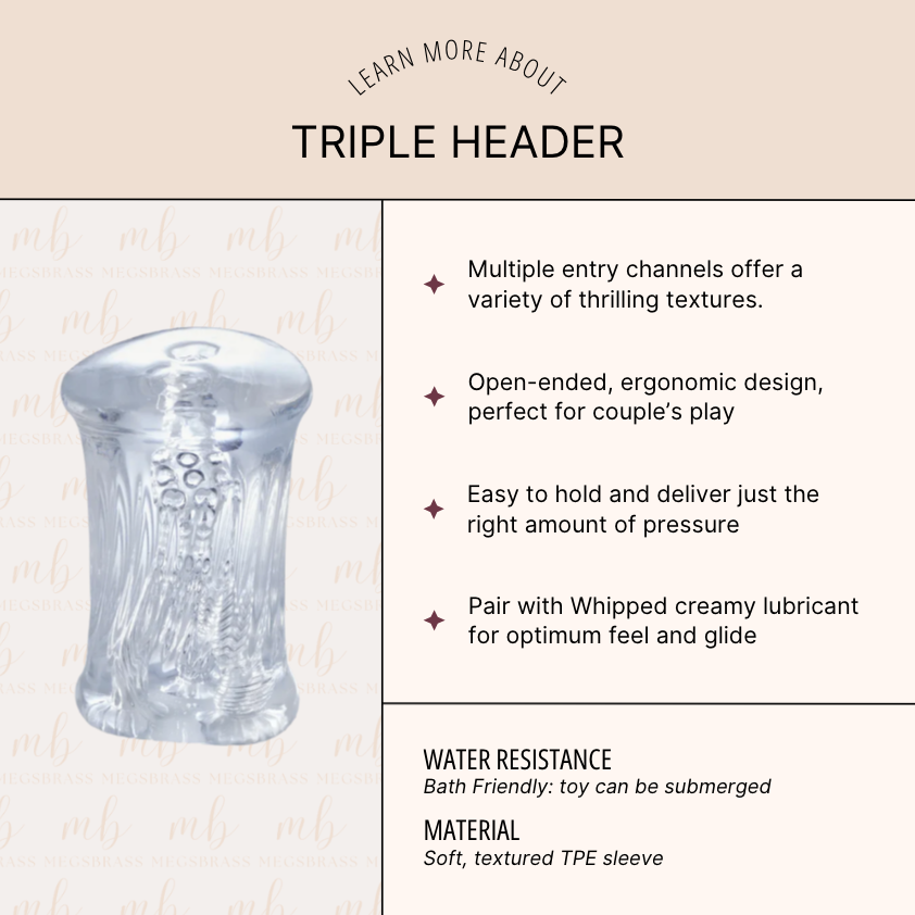 Why make a choice when you can have it all? Say hello to Trifecta, our multi-channeled masturbator that puts pleasure in your hands. Trifecta features an open-ended design with a single opening on one side, and three choices of entry channels on the other – each with a different tantalizing texture: